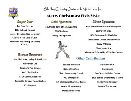 December 24, 2025 - On behalf of the entire team at Shelby County Outreach Ministries, we want to extend our heartfelt gratitude to the generous sponsors who made the "Merry Christmas Elvis Style" fundraiser a spectacular success!