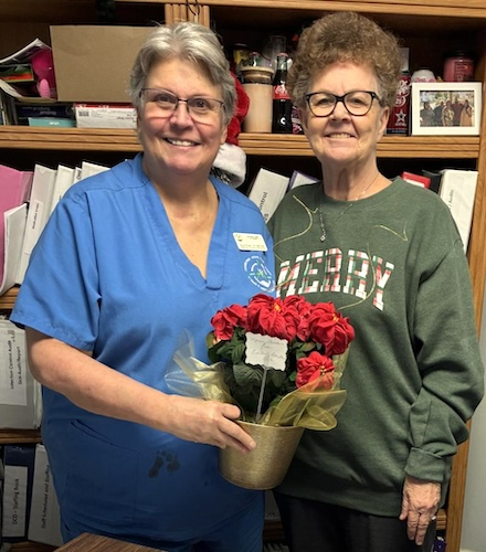 January 2, 2026 - In keeping with Center Garden Club's goal of sharing Nature's beauty throughout our community, the month of December saw Merry Carnes presenting a lovely double red poinsettia to Focused Care of Center Nursing Home. Pictured receiving the poinsettia from club member Merry Carnes (right) is Director of Nursing Susan Dinbali (left).