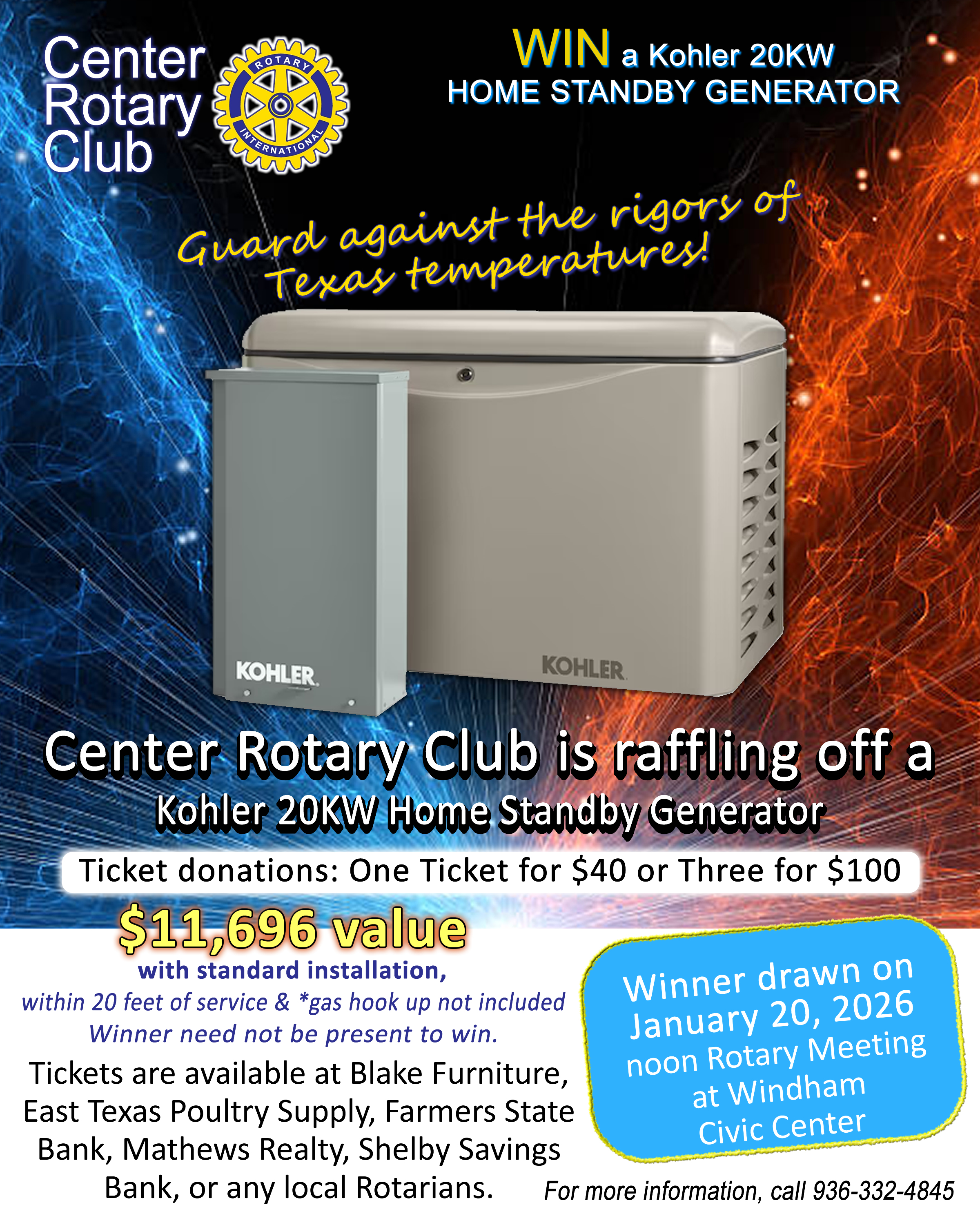 January 6, 2026 - The Rotary Club of Center is hosting a fundraiser with the grand prize being a Kohler 20KW Home Standby Generator valued at $11,696! Ticket donations are $40 for one ticket or $100 for 3 tickets. The winner will be drawn on Saturday, Tuesday, Janaury 20, 2026 during the Rotary Club noon meeting!