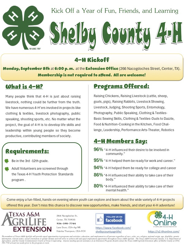 September 3, 2025 - Join Shelby County 4-H on Monday, September 8 at 6pm at the Extension Office, 266 Nacogdoches Street, Center, Texas 75935). Membership is not required to attend. All are welcome!
