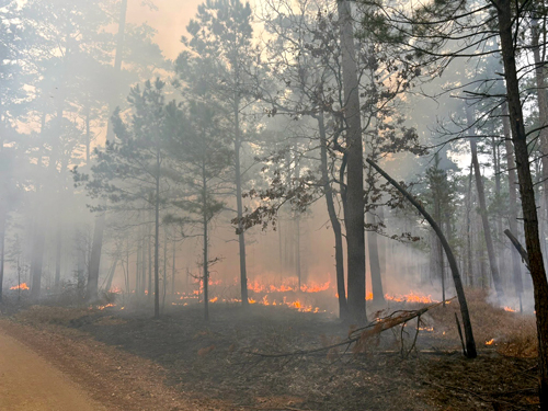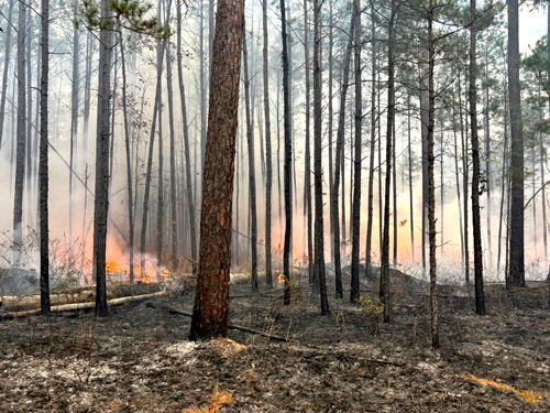 Burnout operations are in progress in the Sabine National Forest area of Shelby County near Huxley.