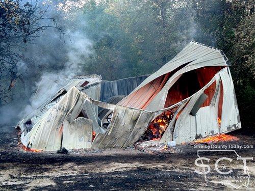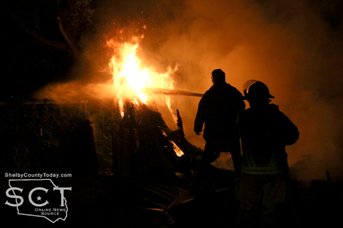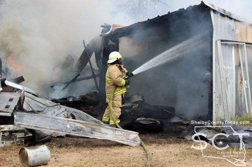 The structure, located across the street from the Shelby County Jail in Center, was fully engulfed in flames behind a vacant residence.