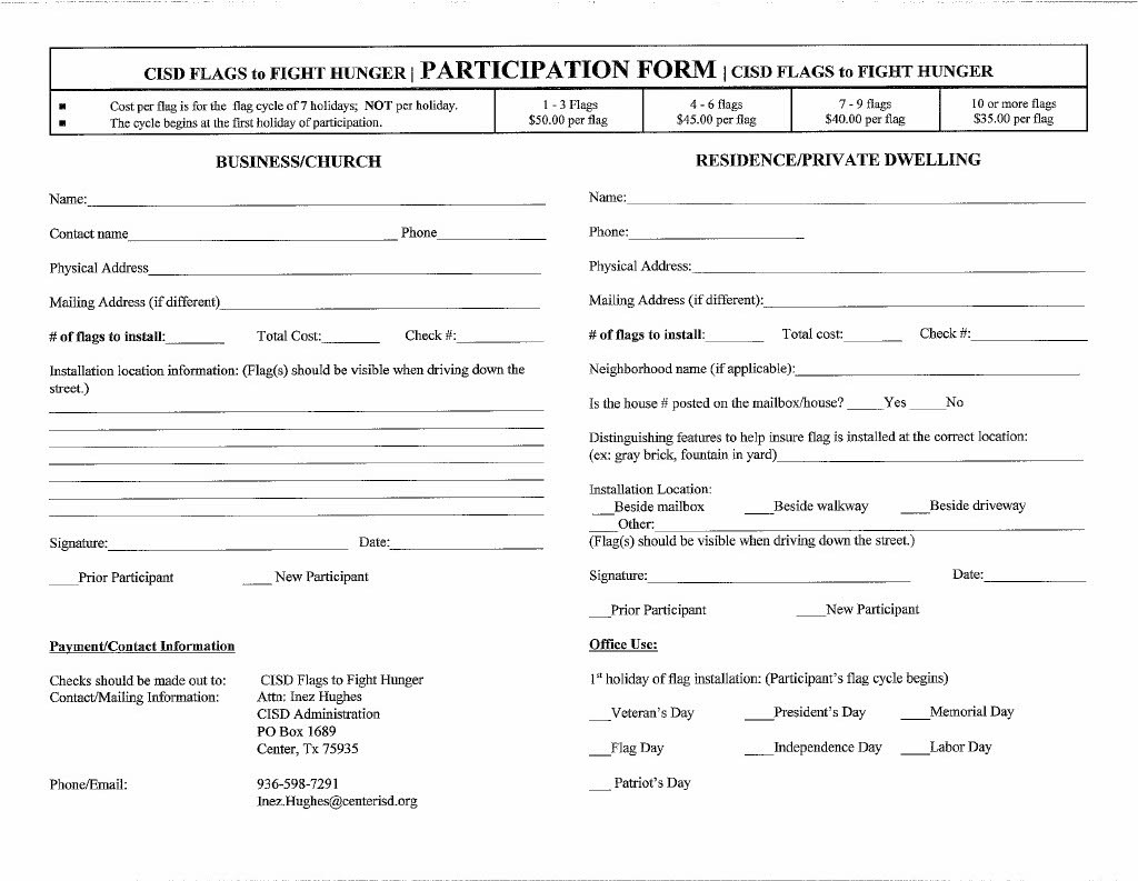 December 1, 2025 - (Participation Form) - If you would like to participate in the Flags to Fight Hunger Program and receive a flag delivered and installed at your home (within the city limits), fill out the form and return to the Center ISD Administration Office and deliver to Inez Hughes. The new flag year starts every January.