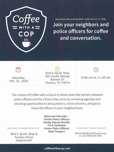 February 5, 2026 - Meet and talk with Tenaha Police Officers, Shelby County Deputy Sheriffs, Precinct 5 Constable, Center Police Officers, and State Troopers on Saturday, February 21, 2026 from 9am until 11am at Bink's Quick Stop in Tenaha.