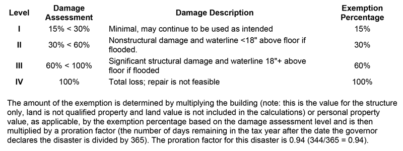 The amount of the exemption is determined by multiplying the building (note: this is the value for the structure only, land is not qualified property and land value is not included in the calculations) or personal property value, as applicable, by the exemption percentage based on the damage assessment level and is then multiplied by a proration factor (the number of days remaining in the tax year after the date the governor declares the disaster is divided by 365). The proration factor for this disaster is 0.94 (344/365 = 0.94).