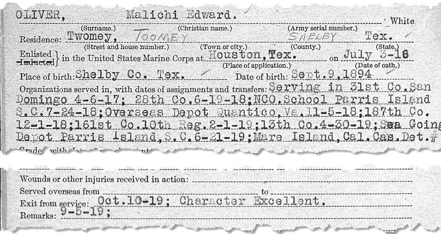The World War had been raging in Europe for two years when Malachi decided to voluntarily enlist in the US Marine Corps. At the age of 22, he traveled from Shelby County to Houston, Texas, and took the oath of enlistment on July 3, 1916. Becoming a US Marine Corps Private, Oliver, serial # 979636, was sent by passenger train to Parris Island, South Carolina to begin basic training. The United States entered the World War on April 6, 1917, as Malachi was assigned occupation duty with the 31 Company in the Dominican Republic and later the 28 Company. In June 1918, he returned to Parris Island, where he completed NCO [Noncommissioned Officer] School. The World War ended on November 11, 1918, and Malachi continued his Marine Corps service at Quantico, Virginia, Parris Island, and Mare Island, California. He was honorably discharged on October 10, 1919, with an " excellent " character rating. He was awarded the World War I Victory Medal for his thirty-eight months of service.