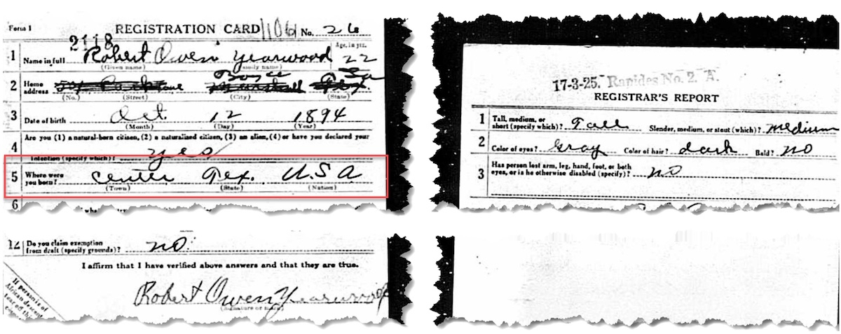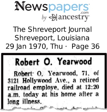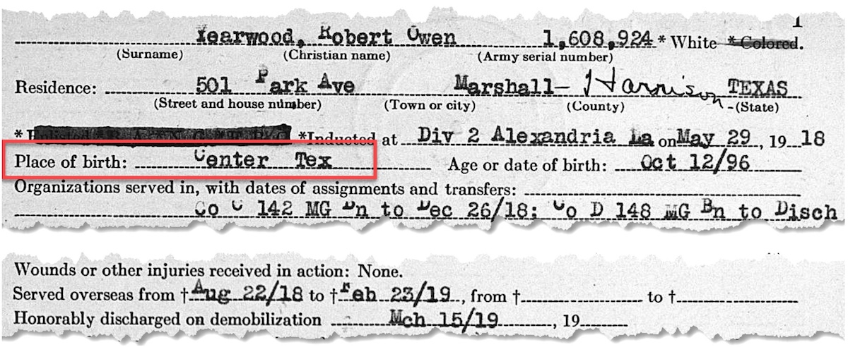 December 23, 2025 - The early life of Robert Owen Yearwood is a bit of a mystery as there are no records or census reports that tell us who his parents were and exactly when and where he was born. The earliest document, his World War I draft registration completed in 1917 shows he was born in Center [Shelby County], Texas on October 12, 1894. A year later his World War I military record lists his birth as October 12, 1896, in Center. Twenty-four years later his World War II draft registration card lists his date of birth as October 13, 1898 and, birthplace as Beaumont, Texas. Finally at life’s end, his obituary states he was born in Shreveport, Louisiana.