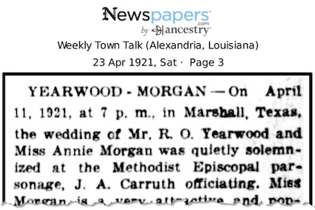 Following the war, Robert returned to Marshall, Texas where his sister Clara lived, and began employment with the Texas and Pacific railway that ran between Marshall and Boyce, Louisiana. In Boyce, he met Miss Annie Morgan and they were married soon afterward. The Weekly Town Talk, Alexandria, Louisiana, April 23rd, 1921 published in part. “On April 11, 1921, at 7 p.m. in Marshall, Texas, the wedding of Mr. R. O. Yearwood and Miss Annie Morgan was quietly solemnized at the Methodist Episcopal parsonage, J. A. Carruth officiating. Miss Morgan is a very attractive and popular young lady of Boyce, La., and loved by all who know her, and is the daughter of Mr. and Mrs. B. M. Morgan who have resided in Boyce for many years. The groom is a well-known young man of Marshall, Texas who is employed with the Texas and Pacific railway. The sister of the groom, Miss Clara Yearwood, acted as maid of honor. Mr. Fred A. Harrell, of Alexandria, was best man. It was quite an exciting romance for the bride and groom to make their get-away from their many friends who now wish them much happiness and success.”