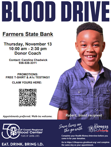 Signup online at https://www.commitforlife.org/donor/schedules/drive_schedule/407331. Promotions include Free T-Shirt and A1c Testing! Don't want to book online, contact Caroline Chadwick via email cchadwick@fsbtx.com or phone 936-598-3311.