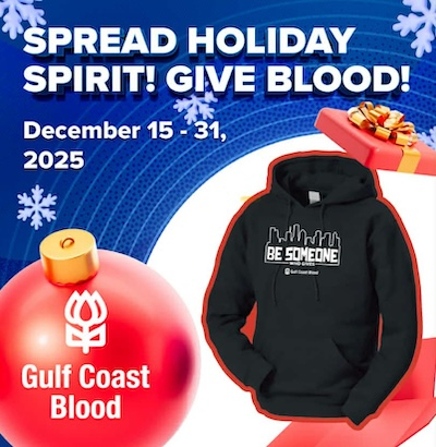 Gulf Coast Regional Blood Center will be set up at the Center Police Department on a Donor Coach Wednesday, December 24th from 10am - 2:30pm. Restrooms and inside seating available. Every attempted donor will be entered for door prizes.
