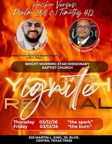 March 2, 2026 - Bright Morning Star Missionary Baptist Church (MBC) is hosting Ignite Youth Revival. The two-day revival is Thursday, March 12 and Friday, March 13 at 7pm nightly.