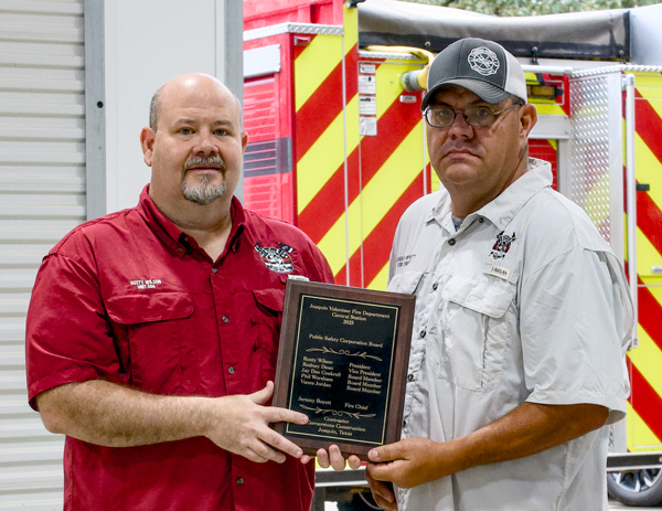 Pictured are (from left): Rusty Wilson, Public Safety Corporation Board President; and Joaquin Volunteer Fire Department Chief Jeremy Boyett.
