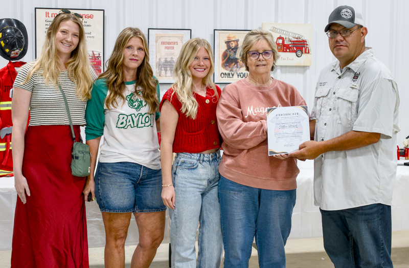 Pictured are family of Mike Woods (from left): Carsen McFarland (granddaughter), Jennifer Whittlesey (daughter), Mary Grace Whittlesey (granddaughter), Lavonne Wood (wife) and Joaquin Volunteer Fire Chief Jeremy Boyett.