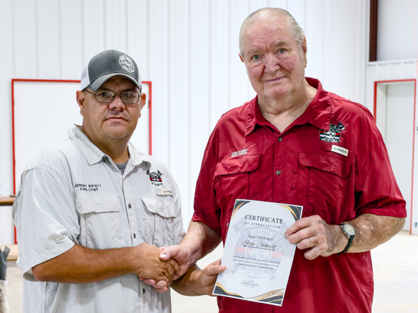 Pictured are (from left): Joaquin Volunteer Fire Chief Jeremy Boyett and past Chief, and current member, Steve Cockrell.