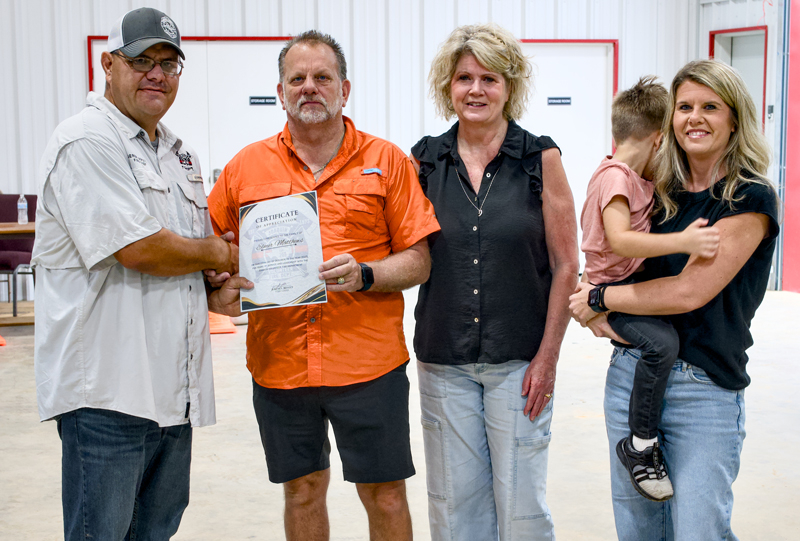 Pictured are family of Jay Dee Cockrell (from left): Kade Cockrell (son), Jodi Cockrell (daughter), Selisha Cockrell (wife), and Joaquin Volunteer Fire Chief Jeremy Boyett.