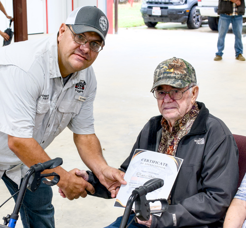 Pictured are family of Elmer Mathews (from left): Joaquin Volunteer Fire Chief Jeremy Boyett, Rodney Mathews (son), Denise Mathews (daughter-in-law), and Amber Mathews (granddaughter) holding Cooper Deshotel (great-grandson).