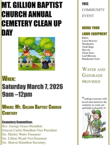 February 24, 2026 - Mt. Gillion Baptist Church is hosting their Annual Cemetery Clean Up Day on Saturday March 7, 2026 from 9am -12 noon. Come to the Mt. Gillion Baptist Church cemetery, bring your lawn equipement, and let’s spend the morning together.
