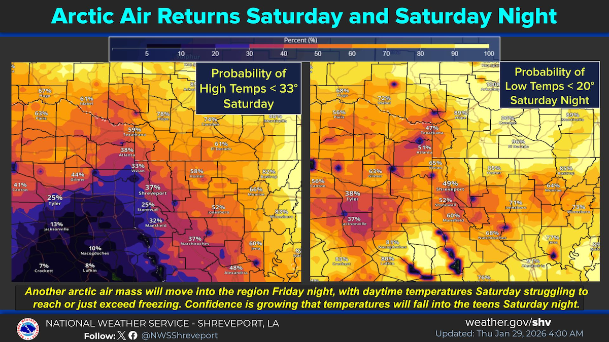 At 9:05am Thursday, January 29, 2026, the National Weather Service, Shreveport, LA issued a cold weather advisory in effect from midnight Friday night to noon Saturday for Shelby County.