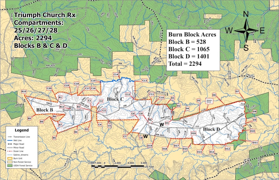 Ignition time is at 11am and will be an aerial start in the Triumph area of Shelby County in the Sabine National Forest, Triumph Church Rx, Block D only, Compartment 27, 28. The burn will be 1,401 acres.