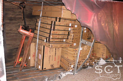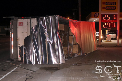 A white 2019 International box truck, owned by Pioneer Star Group Inc, and carrying a load of boxed furniture had been traveling east from State Highway 7 West onto San Augustine Street at too high of a rate of speed when it traveled onto the sidewalk. The driver overcorrected and this caused the truck to flip and skid along the roadway.