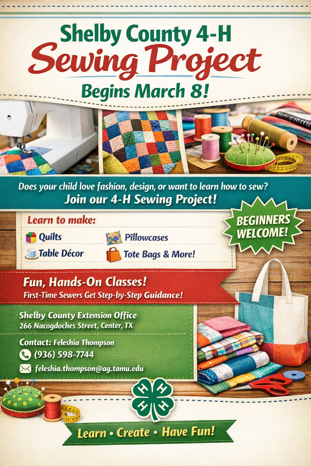 February 26, 2026 - (Flyer) - Shelby County 4-H is excited to launch its new Sewing Project beginning March 8, 2026 at 3pm, inviting local youth to explore the creative world of fashion, design, and hands-on craftsmanship.