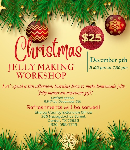 The workshop will be held on Tuesday, December 9, 2025, from 5pm to 7:30pm at the Shelby County Extension Office, 266 Nacogdoches Street, Center, Texas. Participants will learn how to prepare beautiful, delicious holiday-themed jellies—perfect for spreading on biscuits, pairing with charcuterie boards, or gifting to friends, family, and coworkers.