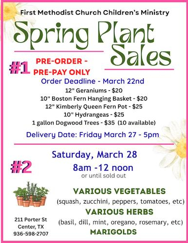 A second way to support the Children's Ministry is Saturday, March 28, 8am until 12 noon or until sold out at First Methodist Church, 211 Porter Street, Center, Texas 75935. Available will be various vegetables - squash, zucchini, peppers, tomatoes, etc.; various herbs - basil, dill, mint, oregano, rosemary, etc.; and Marigolds.