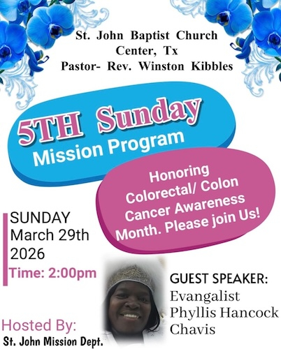 March 28, 2026 - St. John Baptist Church, Center, Texas and Rev. Winston Kibbles are hosting the 5th Sunday Mission Program honoring Colorectal / Colon Cancer Awareness Month on Sunday, March 29, 2026 at 3pm. Guest speaker is Evangalist Phyllis Hancock Chavis. Please join Us!