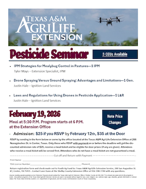 RSVP by sending in the form attached to the flier or come by the office located at the Texas A&M AgriLife Extension Office at 266 Nacogdoches St. in Center, Texas. Only those who RSVP with payment on or before the deadline will get the dis- counted admission rate of $25, receive a meal ticket and be eligible for door prizes (if any are given). Attendees who receive a meal ticket will be served first. Attendees who do not have a meal ticket are not guaranteed a meal.