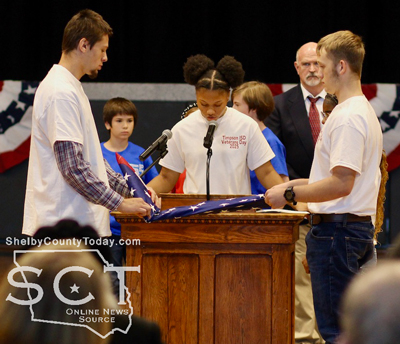 The patriotic event was accompanied by music provided by the Timpson High School band and Timpson ISD students posted the colors.