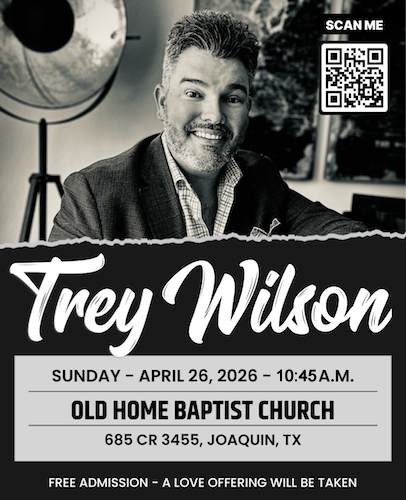 March 3, 2026 — Southern Gospel music veteran Trey Wilson will appear in concert on Sunday, April 26, during the 10:45am worship service at Old Home Baptist Church in Joaquin, Texas. Admission is free, and a love offering will be received during the service.