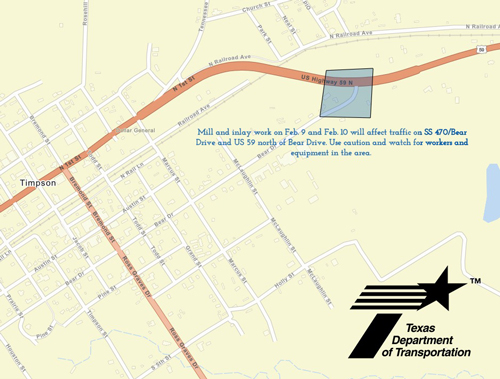 TxDOT crews will mill and inlay Bear Drive/SS 470 on Monday, Feb. 9 and on US 59 north of Bear Drive on Tuesday, Feb. 10. Use caution in the area and give workers and equipment extra room.
