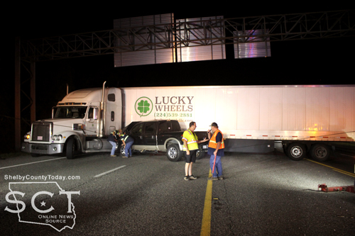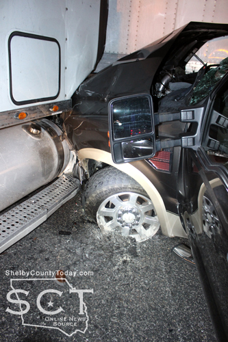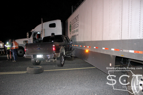 Immediately following the collision, the southbound traffic lanes were completely blocked by the large truck and trailer blocking the roadway. The pickup truck remained lodged in the left side of the truck and trailer until it could be separated by a wrecker crew.