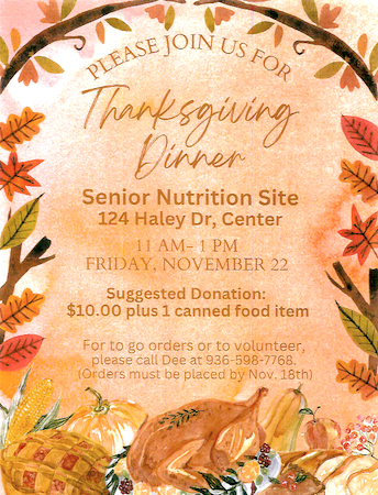 November 7, 2025 - Thanksgiving Dinner at the Senior Nutrition Site is from 11am until 1pm Friday, November 21st. A suggested donation is $10 plus 1 canned food item.