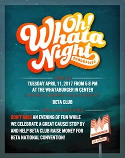 April 11, 2017 - The Center Beta Club is hosting a fundraiser with Whataburger, "Oh! WhataNight" on Tuesday, April 11, 2017 from 5-8pm at the Whataburger in Center. Whataburger will donate 25% of sales to Beta Club, dine in and drive thru.