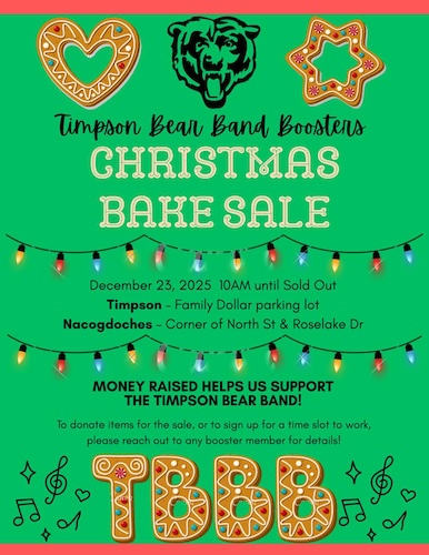 December 19, 2025 - Oh snap, it’s a Bake Sale! The Timpson Bear Band Boosters are back and spreading holiday cheer the best way we know how — with baked goods. Join us for our Christmas Bake Sale and turn your sweet tooth into a good deed.